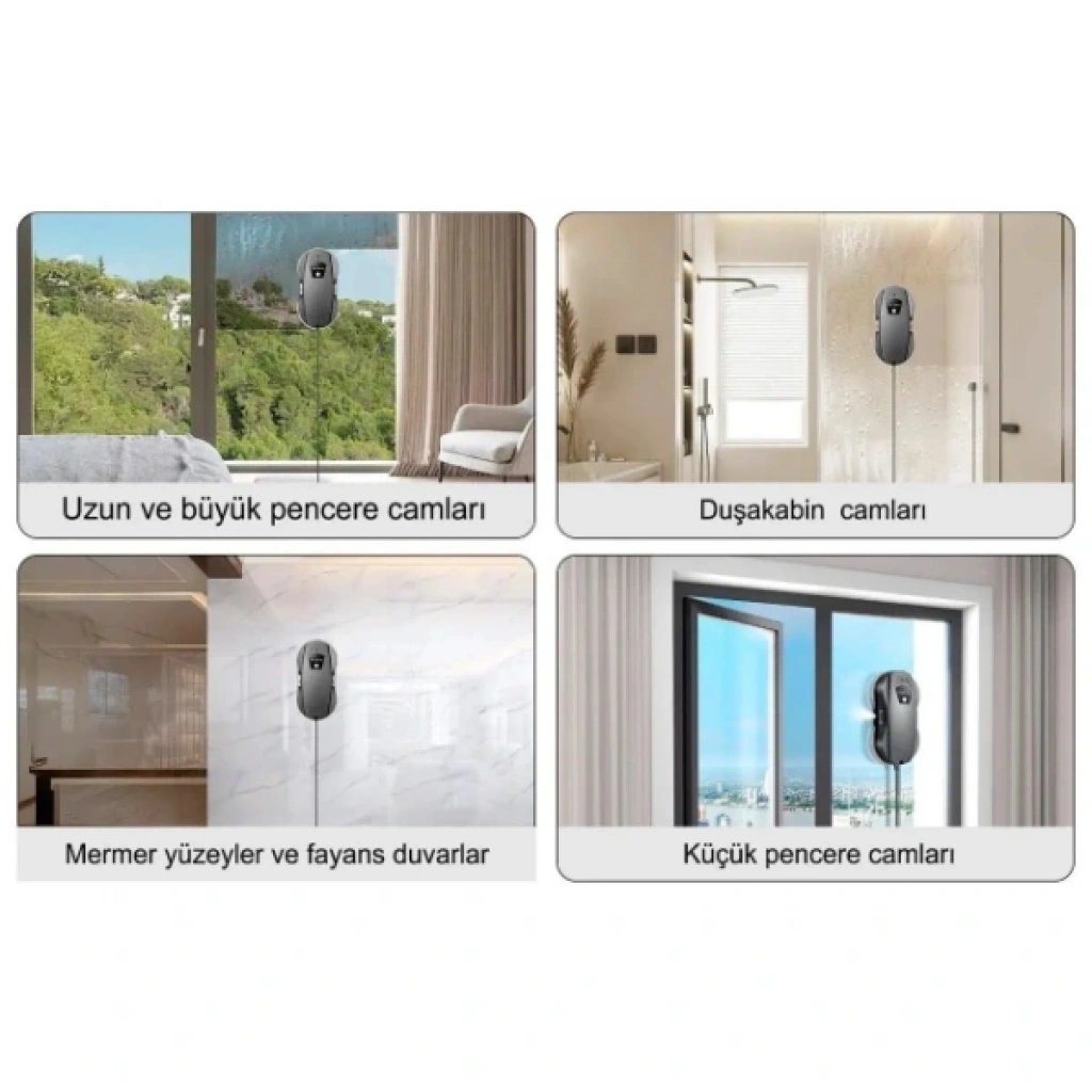CAM SİLME ROBOTUÜrün ÖzellikleriCam Silme Robotu, pencereleri elle temizleme zahmetini ortadan kaldıran gelişmiş ve tamamen otomatik bir temizlik robotudur. Sağ-sol, sol-sağ ve yukarı-aşağı olmak üzere 3 farklı çalışma moduna sahiptir ve dar alanlara kolayca uyum sağlayarak cam yüzeylerde kusursuz temizlik performansı sunar. Vakum teknolojisi sayesinde yüzeye güvenli şekilde tutunur, camları silerken aynı anda temizleme ve parlatma işlemlerini gerçekleştirir. Geniş yüzeylerde olduğu kadar balkon camları, yüksek pencereler ve zor erişilen alanlarda da etkili çalışır. İçerisinden çıkan güvenlik halatı ile yüksek camlarda ekstra güvenlik sağlar. Şarjlı yapısı, özel temizleme bezleri ve sprey şişesiyle birlikte hijyenik ve pratik bir kullanım sunar. Ev, ofis ve mağaza vitrinlerinde cam temizliğini kolaylaştıran güçlü ve modern bir çözümdür.Paket İçeriği1 Adet Cam Silme Robotu1 Adet Güç Adaptörü1 Adet Güvenlik Halatı1 Set Temiz Bez Yedekleri1 Adet Sprey Şişesi