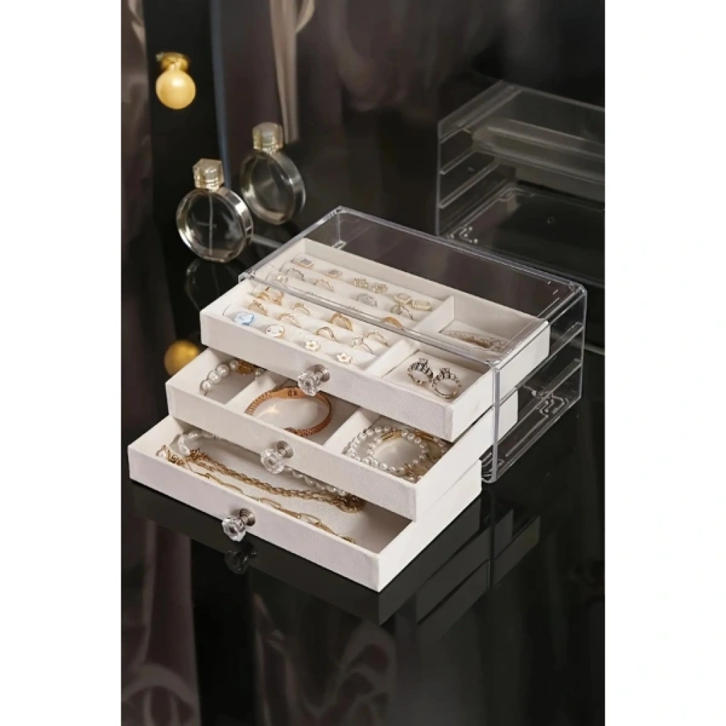 ÜÇ KATLI TAKI ORGANİZERİÜrün ÖzellikleriÜç Katlı Takı Organizeri, üç katlı çekmeceli tasarımı ile farklı türdeki takıların (yüzük, küpe, kolye, bileklik vb.) ayrı ayrı saklanmasına olanak tanır. Kadife kaplı iç bölmeler, takıların çizilmesini önler ve şık bir sunum sağlar. Saydam akrilik dış kapak, tozlanmayı engellerken içeriğin kolayca görünmesini sağlar. Kristal görünümlü çekmece kulpları ise dekoratif bir detay olarak tasarıma zarafet katar. Çok gözlü iç yapısı, küçük aksesuarların karışmadan düzenli bir şekilde durmasını sağlar. Bu düzenleyici kutular, hem evde takı organizasyonu sağlamak hem de makyaj masası veya komodin üzerinde dekoratif bir görünüm oluşturmak için idealdir.Paket İçeriği1 Adet Üç Katlı Takı Organizeri
